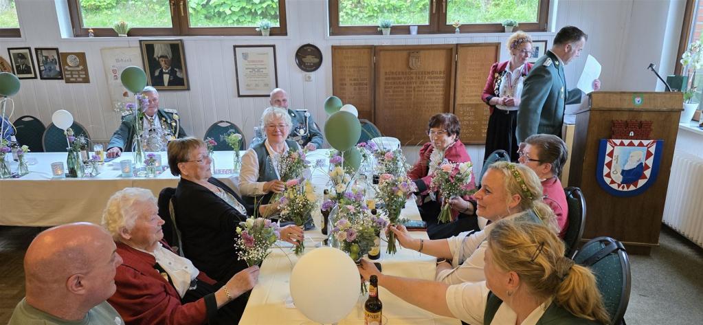 Nachdem sie und Ute ihre Sträuße durch die Älterleute Detlef und Uwe überreicht bekommen haben, hat Melli ihren großen Blumenstrauß aufgebunden und zum Vorschein kamen sieben kleine Blumensträuße für ihre anwesenden Gildeschwestern und unsere Freundin aus dem Rheinland, Renate Koch.