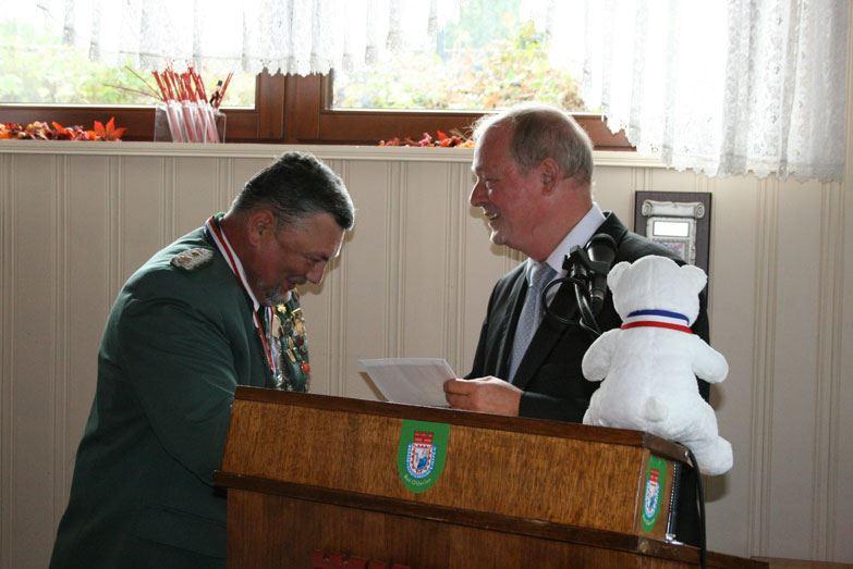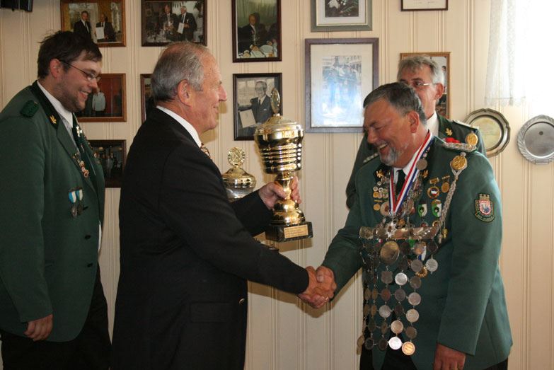 Hubert Priemel (Alt-Kreistagspräsident) überreicht Karl-Otto Bergmann den errungenen "Priemelpott"