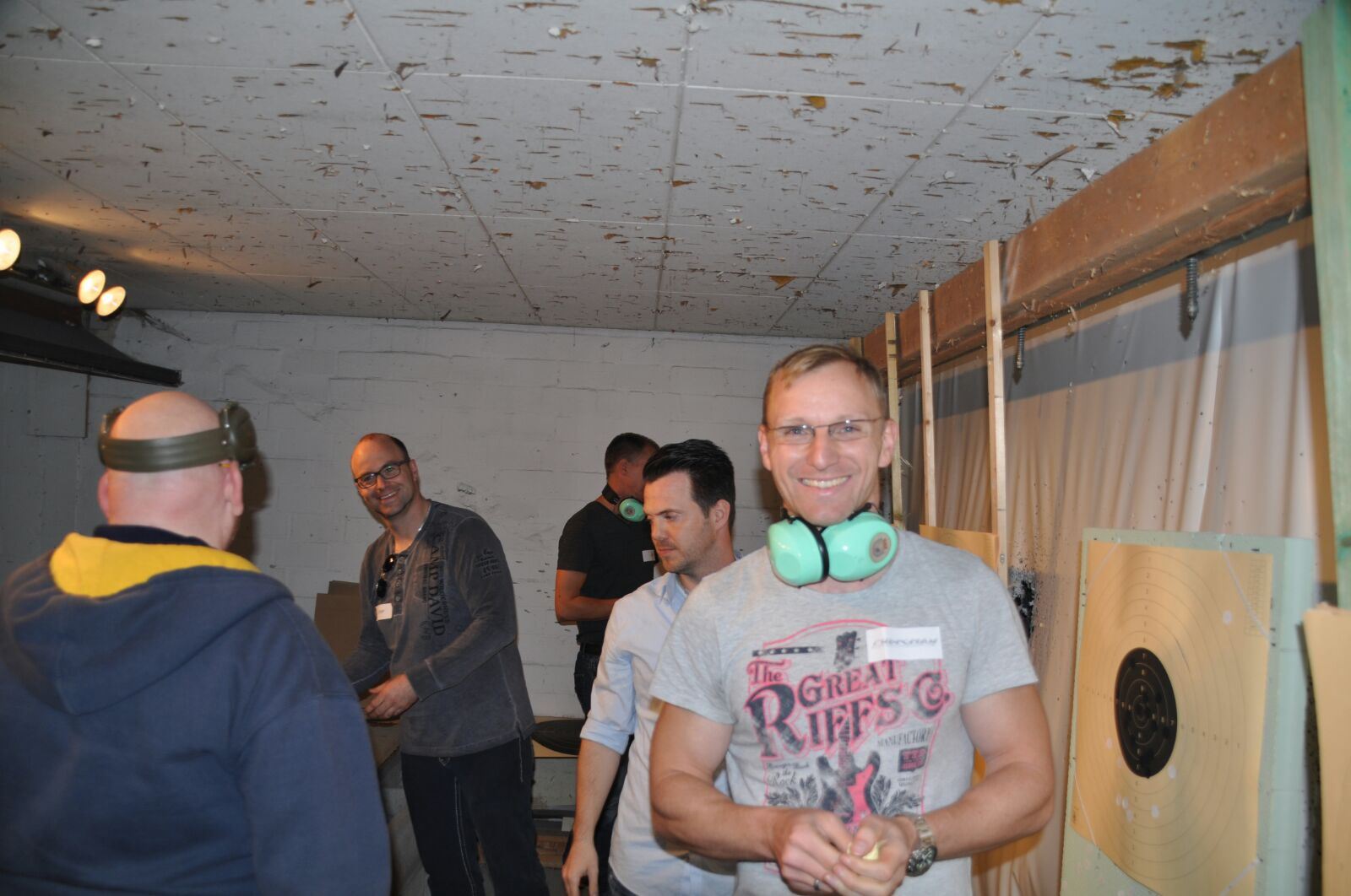 Nach erfolgter Sicherheitsunterweisung durch Thomas, standen er und die weiteren Aufsichten Melanie, Andreas, Dieter, Dirk, Ralf und Timo den Sportwagenfahrern mit Rat und Tat zur Seite und gaben hilfreiche Tipps beim Klein- und Großkaliberschießen.